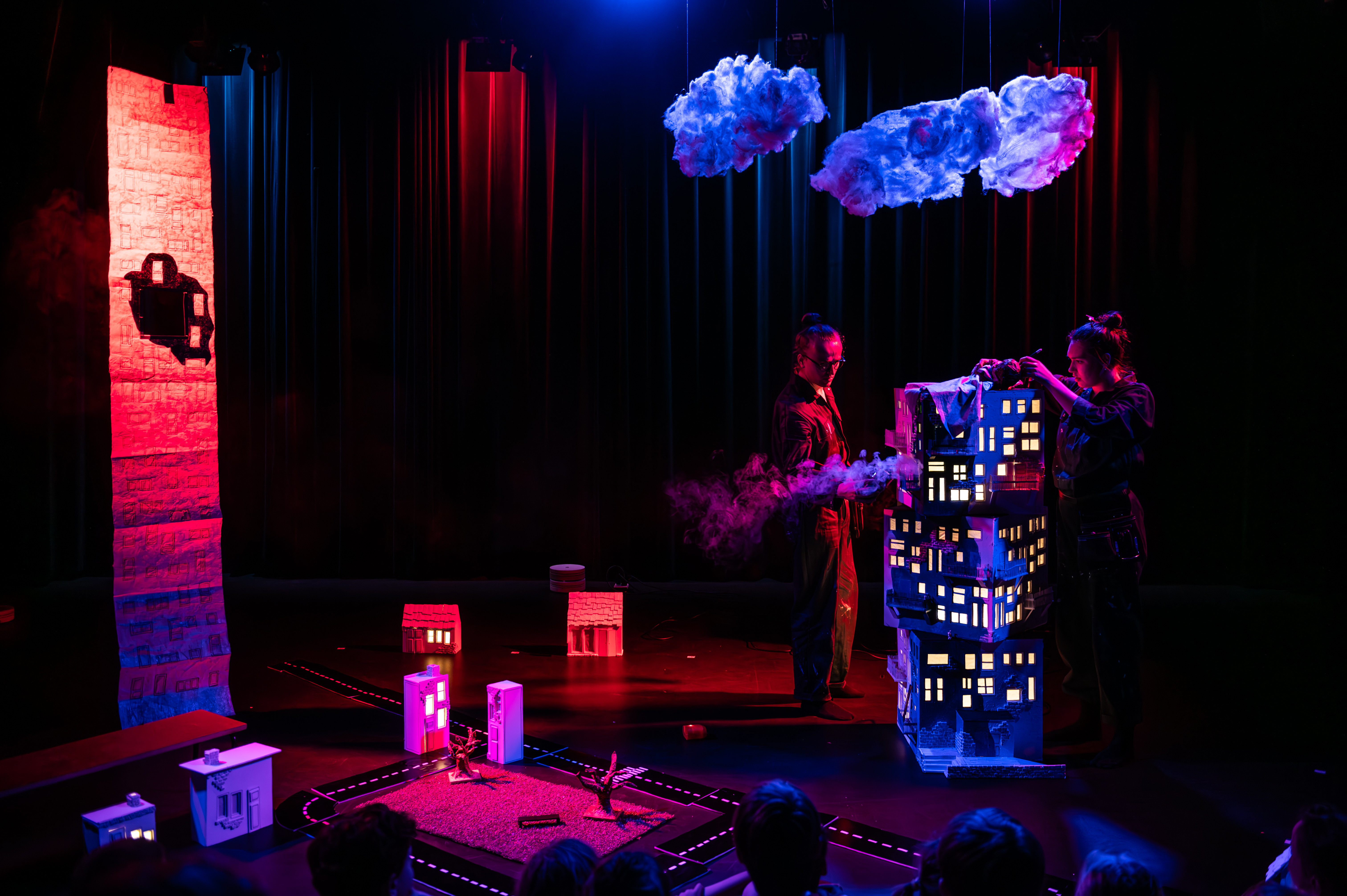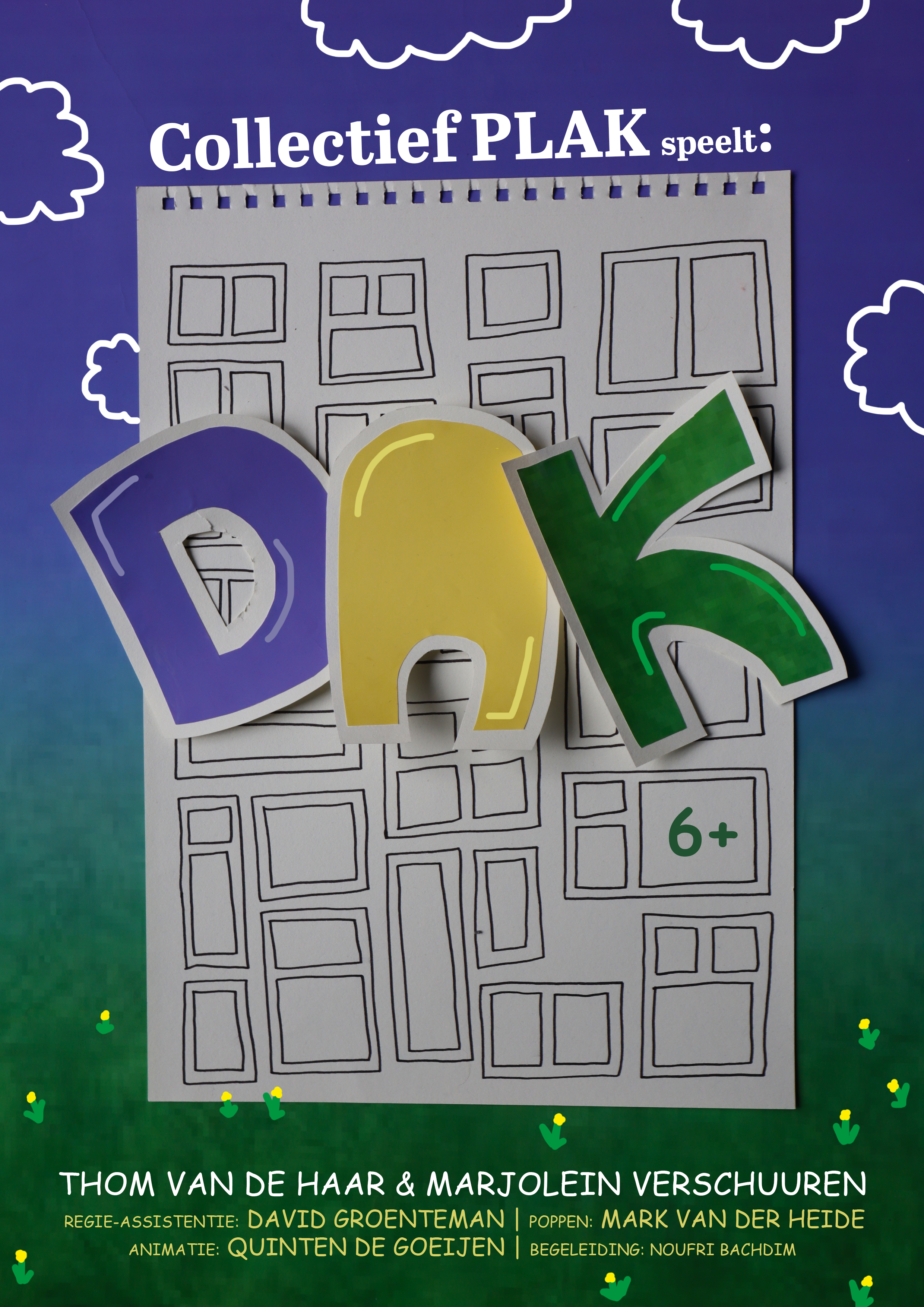 DAK, het debuut van Collectief PLAK, is een technologische beeldende voorstelling. Het verhaal wordt volledig verteld vanuit beeldvorming: een miniatuurwereld van maquette, animatie, projectie, licht, kleur en figuren. Observeer, ervaar en kijk mee naar een verhaal over contact, erkenning en herkenning.